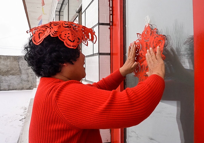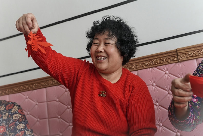 土默特剪紙非遺傳承人李還秀正和姐妹們在炕頭上剪窗花