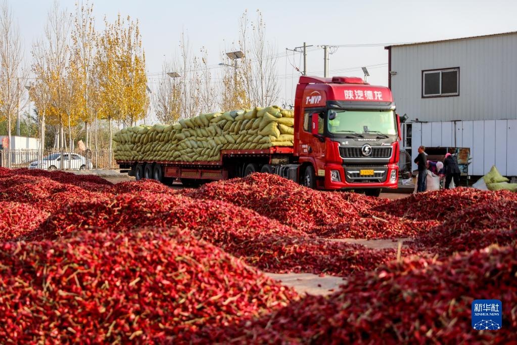 10月25日,在開(kāi)魯縣東風(fēng)鎮(zhèn)一家紅干椒銷售企業(yè)的廠區(qū)內(nèi),裝滿紅干椒的卡車(chē)準(zhǔn)備開(kāi)往四川。新華社記者 連振 攝