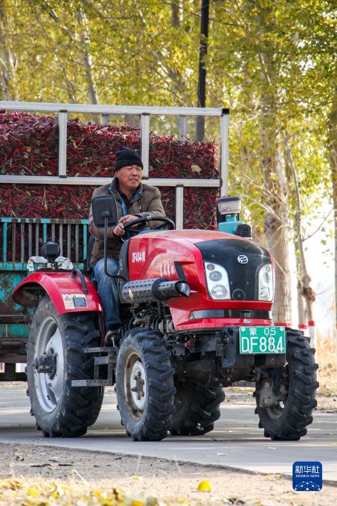 10月25日,在開(kāi)魯縣東風(fēng)鎮(zhèn)東方紅村,村民駕駛拖拉機(jī)運(yùn)輸紅干椒。新華社記者 連振 攝