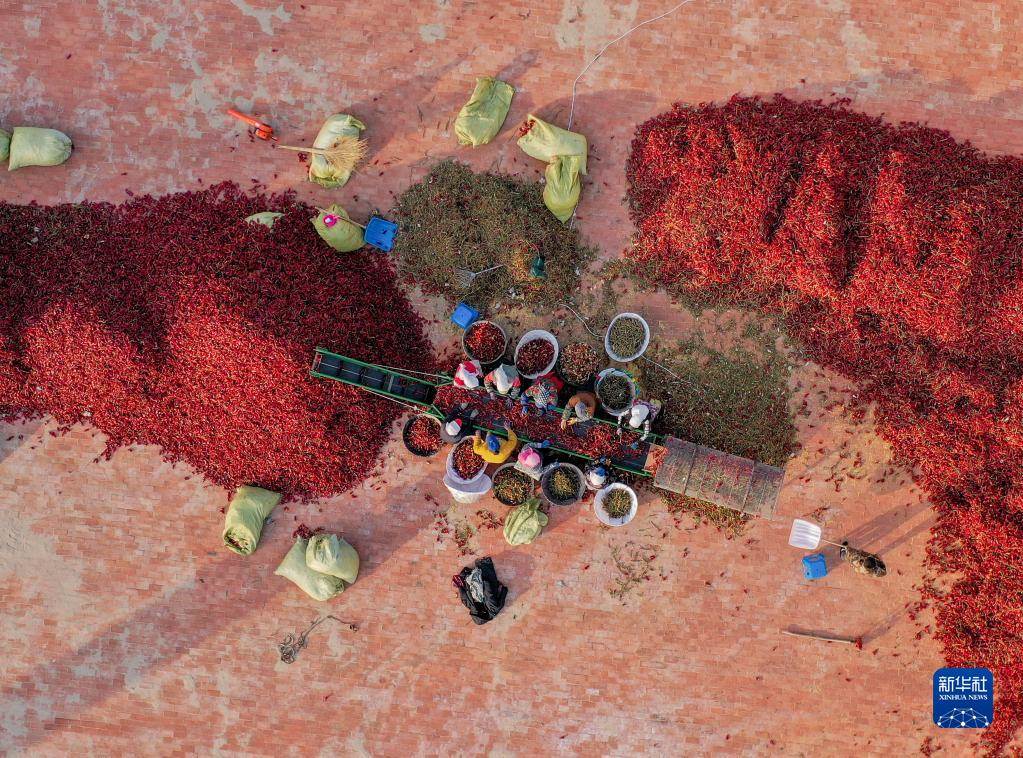 10月25日,在開(kāi)魯縣東風(fēng)鎮(zhèn)東方紅村,工作人員分揀處理紅干椒(無(wú)人機(jī)照片)。新華社記者 連振 攝