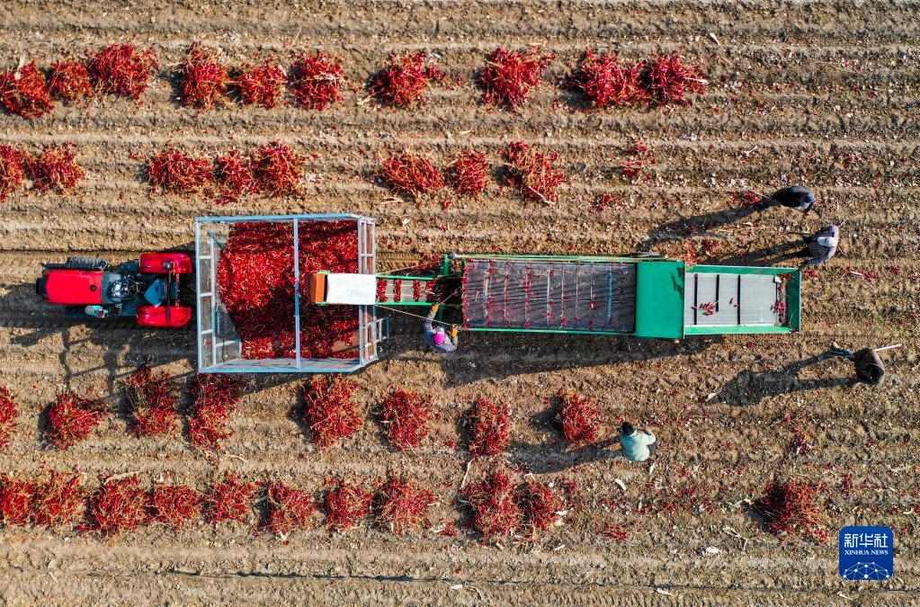 10月25日,在開(kāi)魯縣東風(fēng)鎮(zhèn),工作人員駕駛鏟車(chē)收獲晾曬好的紅干椒(無(wú)人機(jī)照片)。新華社記者 連振 攝