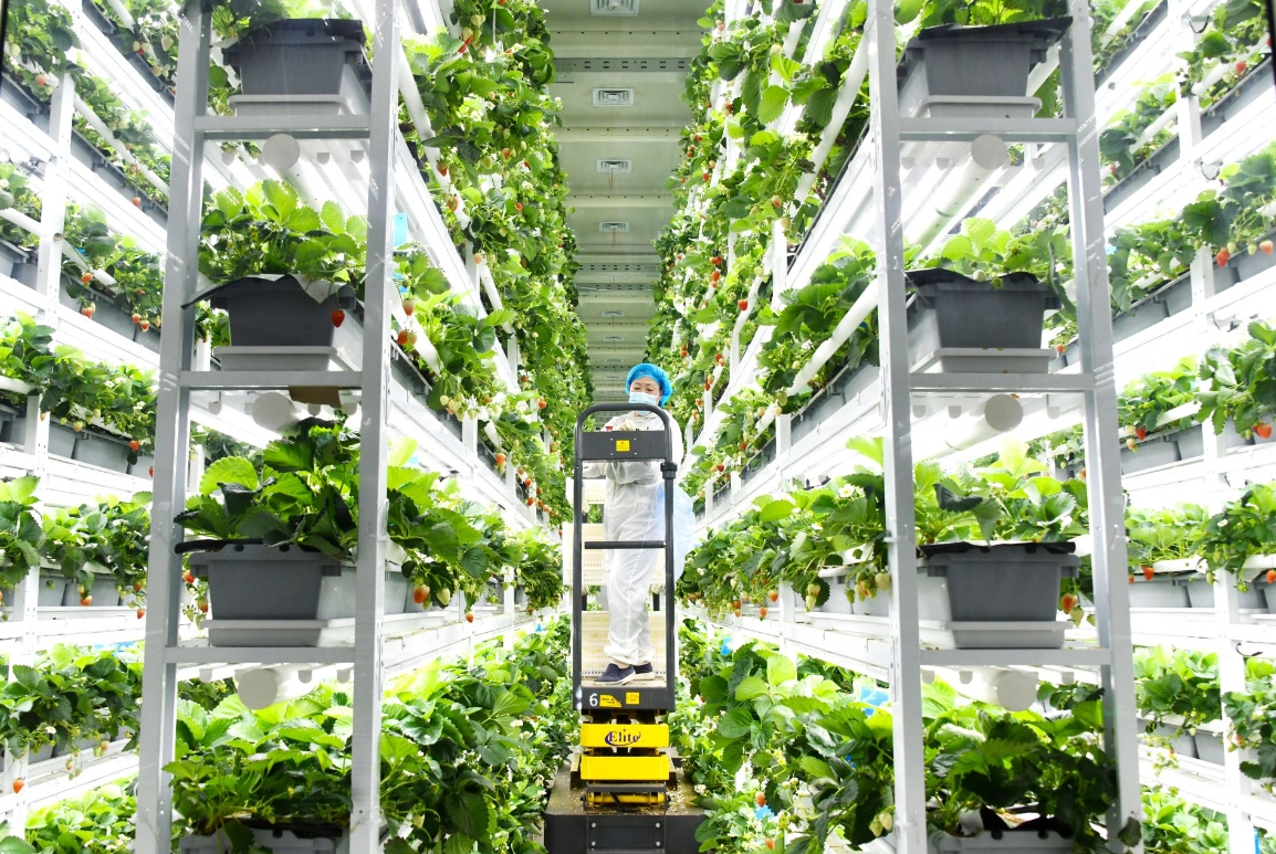在工作人員的帶領(lǐng)下,記者來到了無菌種植車間。車間內(nèi),四列八層垂直栽培架拔地而起,茂密枝葉間,一顆顆草莓俏皮地探出頭來,紅的熱烈、粉的溫柔,點(diǎn)綴其間。“嗡嗡”聲中,身披絨毛的熊蜂穿梭于植株間,時(shí)而停駐花朵,為授粉而忙碌不停。工作人員身穿防護(hù)服,乘坐高空升降車,熟練地進(jìn)行采摘。車間內(nèi),沒有土壤、沒有陽光,卻處處涌動著生命的蓬勃。