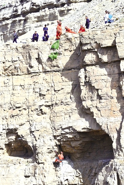 當(dāng)天7時左右,在烏海市海勃灣區(qū)甘德爾山景區(qū)半山腰處,攝影愛好者焦長青在拍攝時發(fā)現(xiàn)了一窩出生20多天的幼年野生黑鸛,其中一只黑鸛行動異常,疑似受傷。他立即撥打了119報警電話,同時聯(lián)系了烏海市野生動物保護(hù)部門。9時許,烏海市消防支援支隊光明路特勤站和烏海市野生動物保護(hù)部門的工作人員到達(dá)現(xiàn)場。經(jīng)勘查,在距離懸崖正下方大約30米處的巖洞內(nèi),一只幼年黑鸛被尼龍繩纏繞住腿部而受傷,不能行動。消防員隨后尋找合適的位置制作錨點。消防員陳意攜帶救援裝備速降到懸崖下方展開營救,一個小時之后,受傷的幼年黑鸛被成功救出,并送往海勃灣區(qū)林業(yè)草原局救助站進(jìn)行救治。