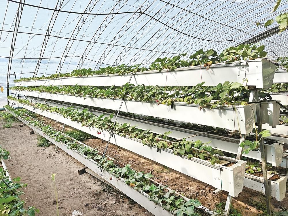 走進草莓大棚內(nèi),濃濃的暖意撲面而來。抬眼望去,離地一米多的種植架上種滿了生機勃勃、長勢喜人的草莓;穿梭在種植架間,一顆顆鮮紅欲滴、圓潤飽滿的草莓宛如璀璨的紅寶石,從綠葉間“探出頭”來,高高地懸掛在空中,散發(fā)著誘人的清香。種植戶牛尚海正在察看采用立體栽培技術(shù)的草莓長勢情況?!斑@是一種三維立體種植方式,能夠充分利用空間和光照,大幅度提高生產(chǎn)效率。以前一畝地最多種8000株,現(xiàn)在能種2.4萬株,產(chǎn)量提高了3倍,而且草莓個頭更均勻,賣相更好?!迸I泻8嬖V記者,這種種植方式不僅省工、省力,還降低了勞動強度,摘草莓也不用彎腰了。此外,這種種植模式比傳統(tǒng)種植模式每畝節(jié)水50%。