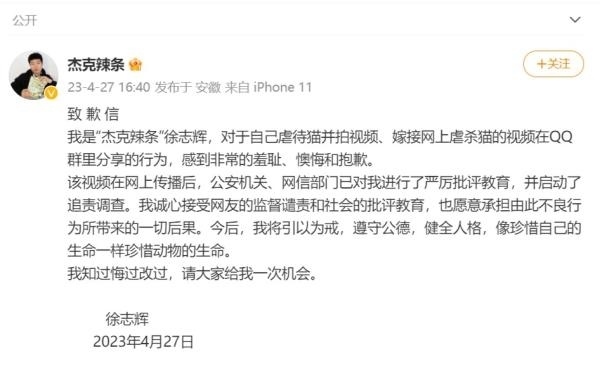 27日16時(shí)40分,@杰克辣條 在微博發(fā)表了署名“徐志輝”的致歉信稱(chēng),對(duì)于自己虐待貓并拍視頻、嫁接網(wǎng)上虐殺貓的視頻在QQ群里分享的行為,感到非常的羞恥、懊悔和抱歉。該視頻在網(wǎng)上傳播后,公安機(jī)關(guān)、網(wǎng)信部門(mén)已對(duì)其進(jìn)行了嚴(yán)厲批評(píng)教育,并啟動(dòng)了追責(zé)調(diào)查。