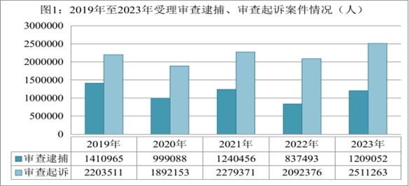 隨著新冠疫情防控轉(zhuǎn)段,我國(guó)經(jīng)濟(jì)回升向好,社會(huì)活躍度增加,同時(shí),檢察機(jī)關(guān)與有關(guān)部門一道依法從嚴(yán)懲處電信網(wǎng)絡(luò)詐騙等嚴(yán)重影響人民群眾安全感的犯罪,刑事犯罪案件總量增長(zhǎng)。2023年,全國(guó)檢察機(jī)關(guān)受理審查逮捕各類犯罪828999件1209052人,同比分別上升49.8%、44.4%。審查后共批準(zhǔn)逮捕72.6萬人,同比上升47.1%;受理審查起訴各類犯罪1786635件2511263人,同比分別上升19.7%、20%。審查后決定起訴168.8萬人,同比上升17.3%。