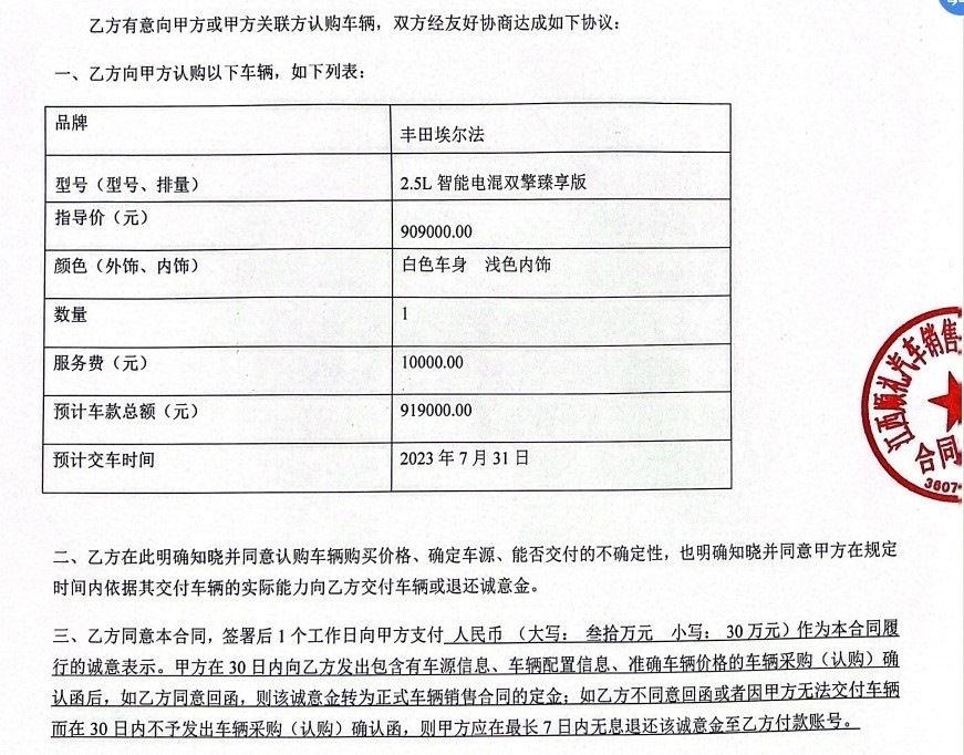 豐田埃爾法汽車,預(yù)計車款總額91.9萬元,其中車輛指導(dǎo)價90.9萬元,服務(wù)費1萬元,預(yù)計交車時間為2023年7月31日。簽訂認購合同當(dāng)天,任先生支付了30萬元誠意金。