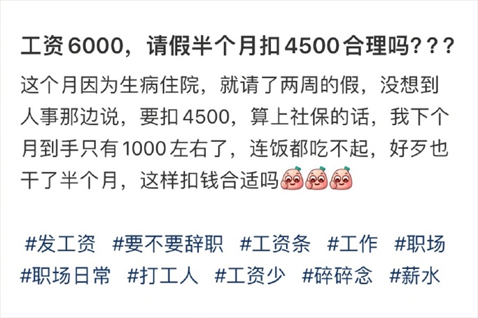 近日,#工資6000請假半個月被扣4500#的話題登上熱搜,引發(fā)關注。