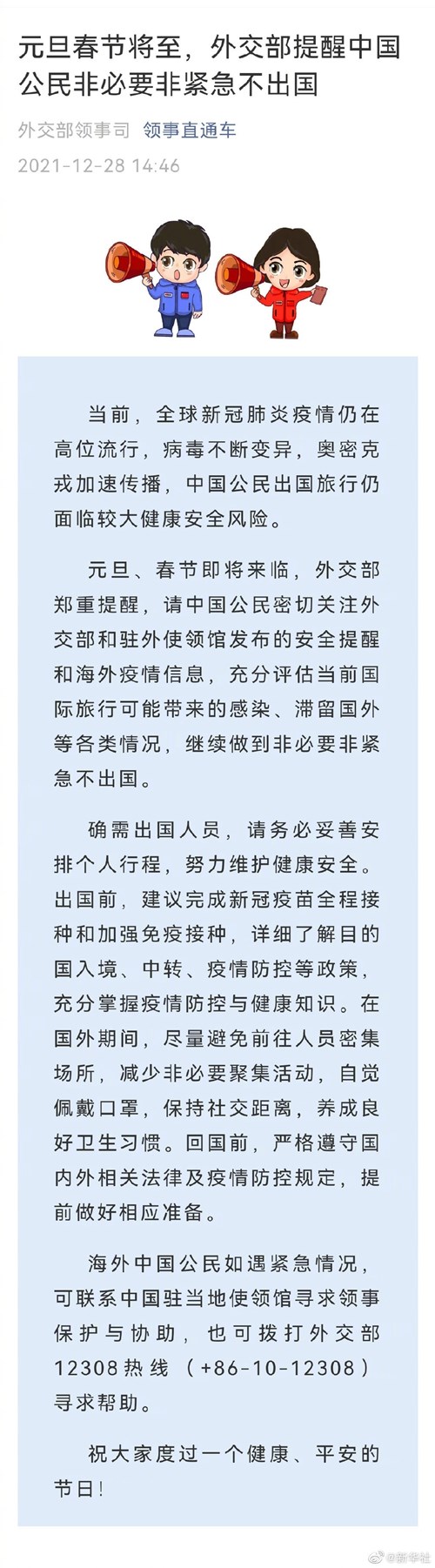 元旦春節(jié)將至,外交部提醒中國公民非必要非緊急不出國