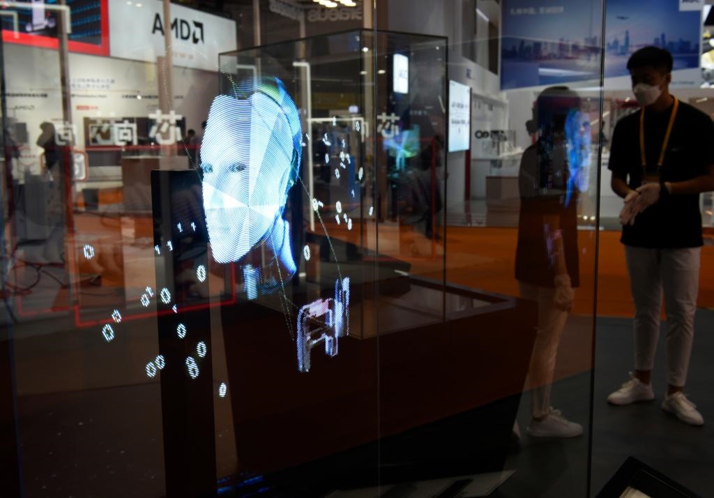 這是2021年11月5日在第四屆進博會技術(shù)裝備展區(qū)SK海力士展臺拍攝的芯片應(yīng)用展示。新華社記者徐亮攝