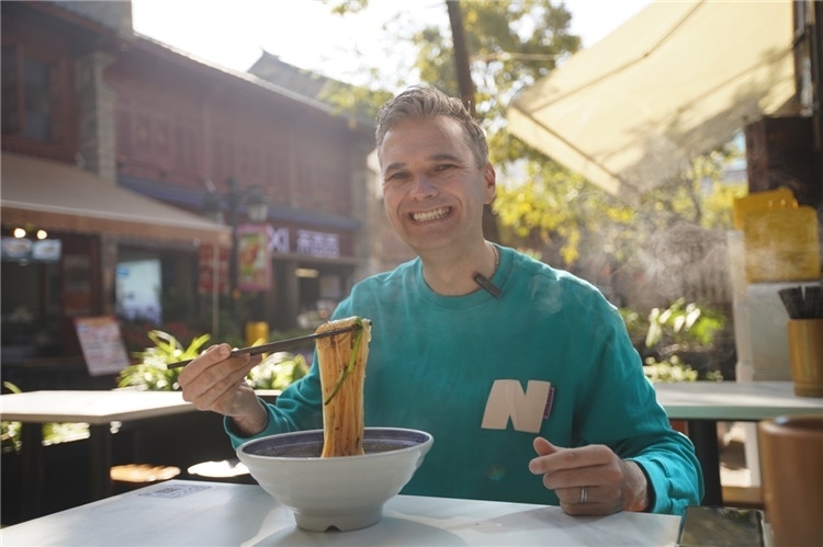 杜安睿在云南昆明文廟街品嘗米線。受訪者供圖