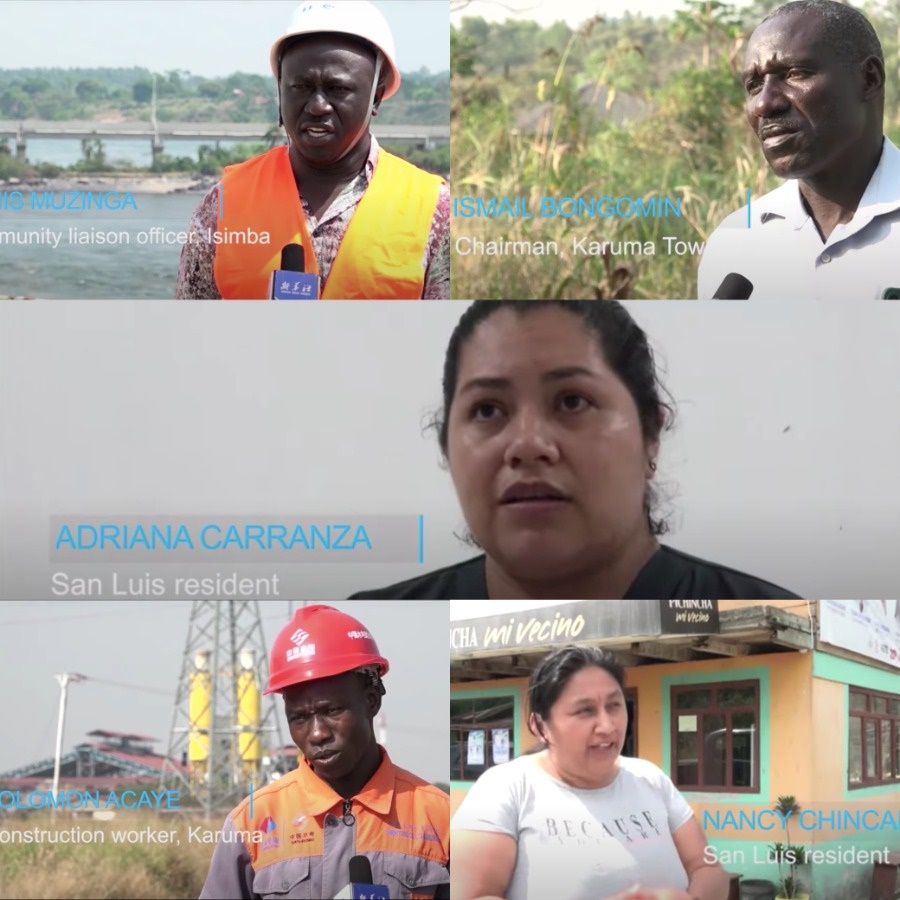 新華社采訪當?shù)孛癖?、中企員工、官員視頻截屏拼圖