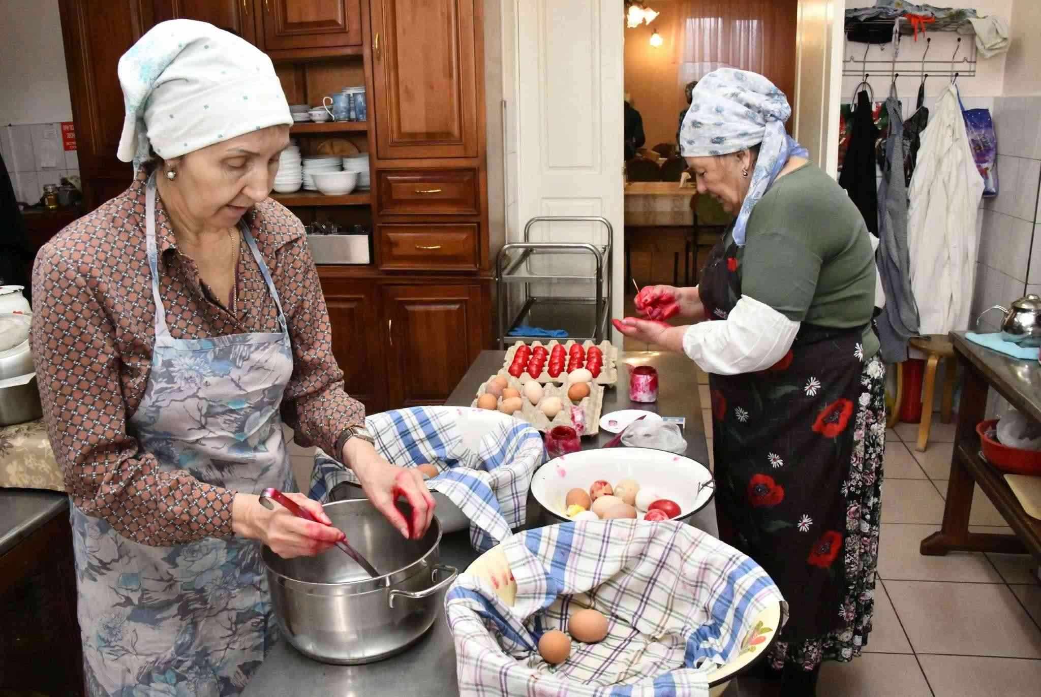 當(dāng)?shù)貢r間2023年4月13日,俄羅斯扎貝卡爾斯基地區(qū),阿塔馬諾夫卡定居點的一修道院內(nèi),民眾在制作東正教復(fù)活節(jié)前的傳統(tǒng)煮雞蛋。視覺中國