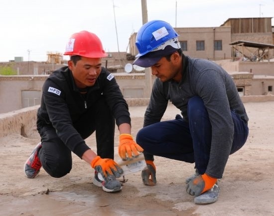 在烏茲別克斯坦希瓦古城哈?!つ吕聨焓矂e吉清真寺,中方文物修復(fù)人員指導(dǎo)烏方工作人員修復(fù)清真寺屋頂。