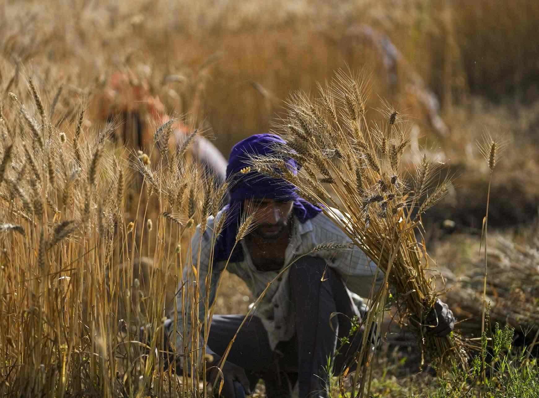 當(dāng)?shù)貢r間2023年4月24日,克什米爾查謨地區(qū),農(nóng)民在收割小麥。