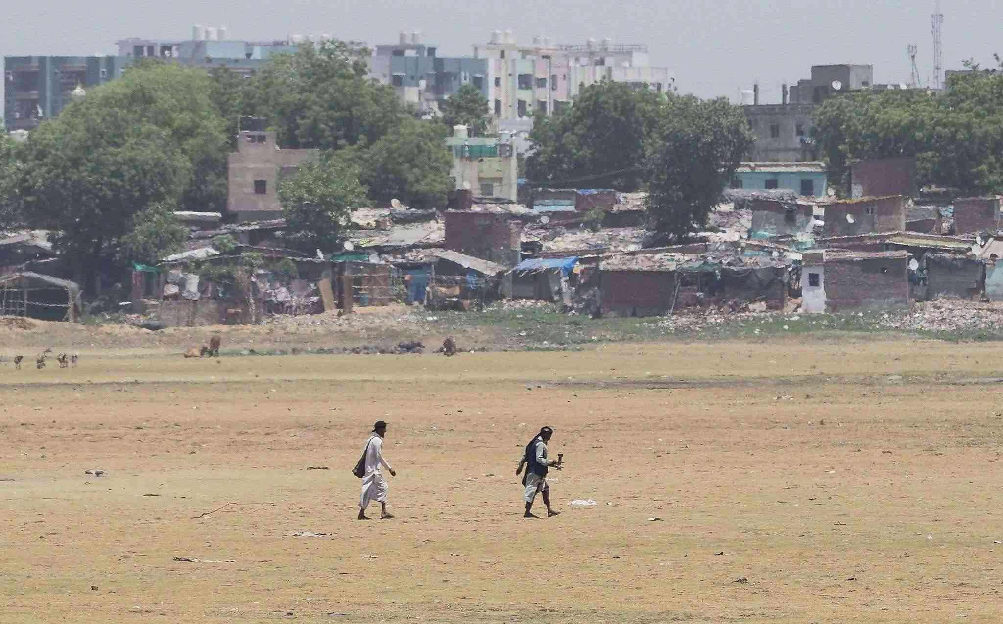 當(dāng)?shù)貢r間2023年5月10日,印度艾哈邁達(dá)巴德,人們走在干涸的河床上。