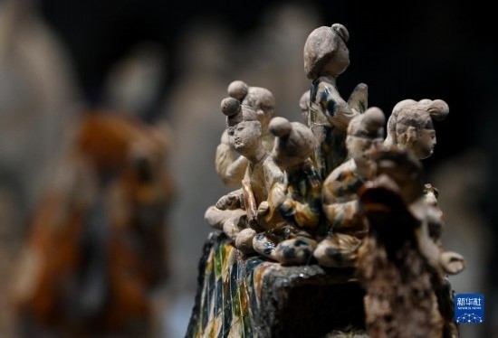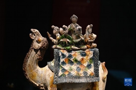 這是在陜西歷史博物館拍攝的唐三彩駱駝載樂俑(5月11日攝)。這件唐三彩駱駝載樂俑既是唐代文化藝術、制作工藝發(fā)達昌盛的重要物證,也見證了絲綢之路上藝術的交流與融合。