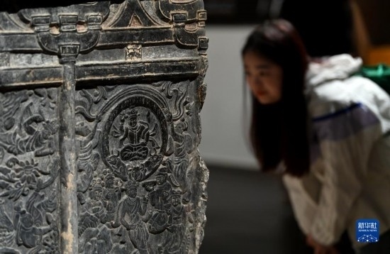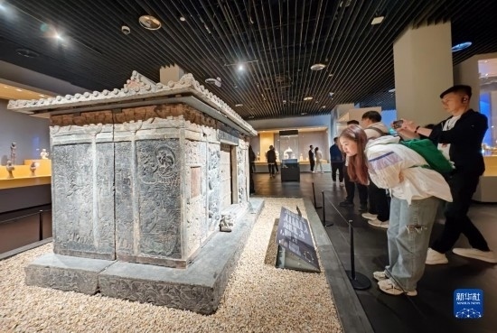 5月8日,游客在西安博物院參觀史君墓石槨。墓主史君是北周涼州薩保,粟特人。石槨整體為中國傳統(tǒng)歇山頂?shù)钐檬浇ㄖ谋诟〉駜?nèi)容和風格則帶有鮮明的西域特色。