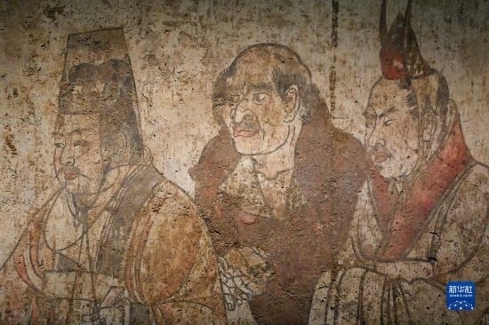 這是在陜西歷史博物館拍攝的唐章懷太子墓《客使圖》(局部)(5月11日攝)。《客使圖》描繪的是唐代外交機構鴻臚寺官員接待外國使節(jié)的場景。