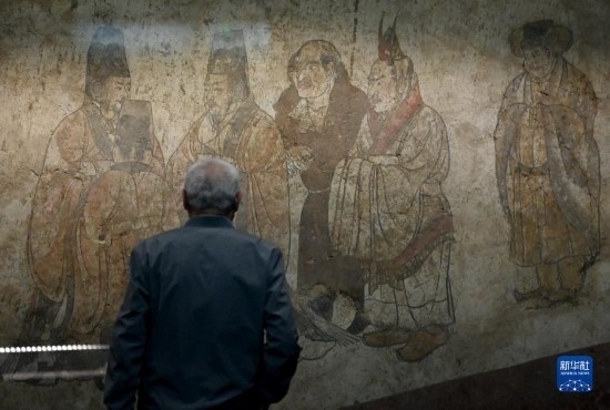 5月11日,游客在陜西歷史博物館內(nèi)觀看唐章懷太子墓《客使圖》?!犊褪箞D》描繪的是唐代外交機構鴻臚寺官員接待外國使節(jié)的場景。