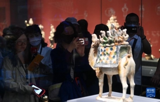5月11日,游客在陜西歷史博物館參觀唐三彩駱駝載樂俑。這件唐三彩駱駝載樂俑既是唐代文化藝術、制作工藝發(fā)達昌盛的重要物證,也見證了絲綢之路上藝術的交流與融合。