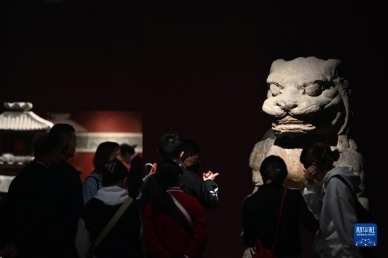 5月9日,游客在西安碑林博物館內(nèi)參觀唐代石獅。古代中國的獅子多通過絲綢之路由外國進貢而來。