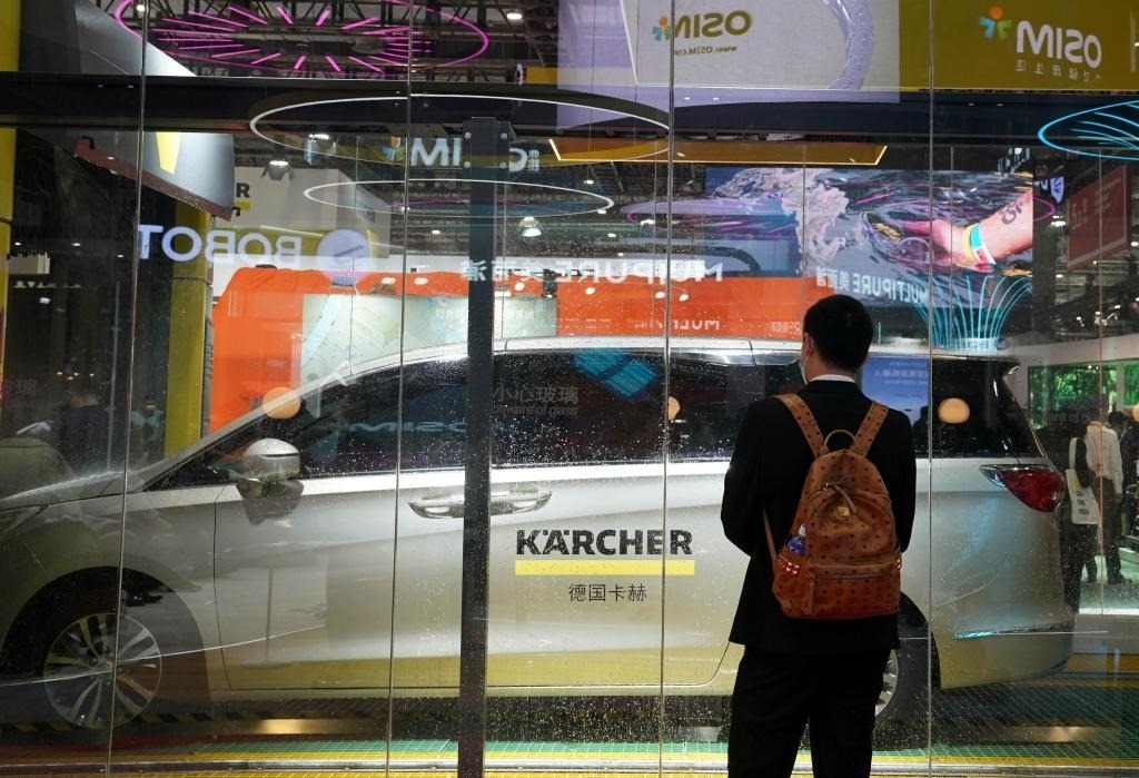 2021年11月6日,觀眾在第四屆進(jìn)博會德國卡赫展臺參觀全自動洗車機(jī)器人的演示。(新華社記者劉穎攝)