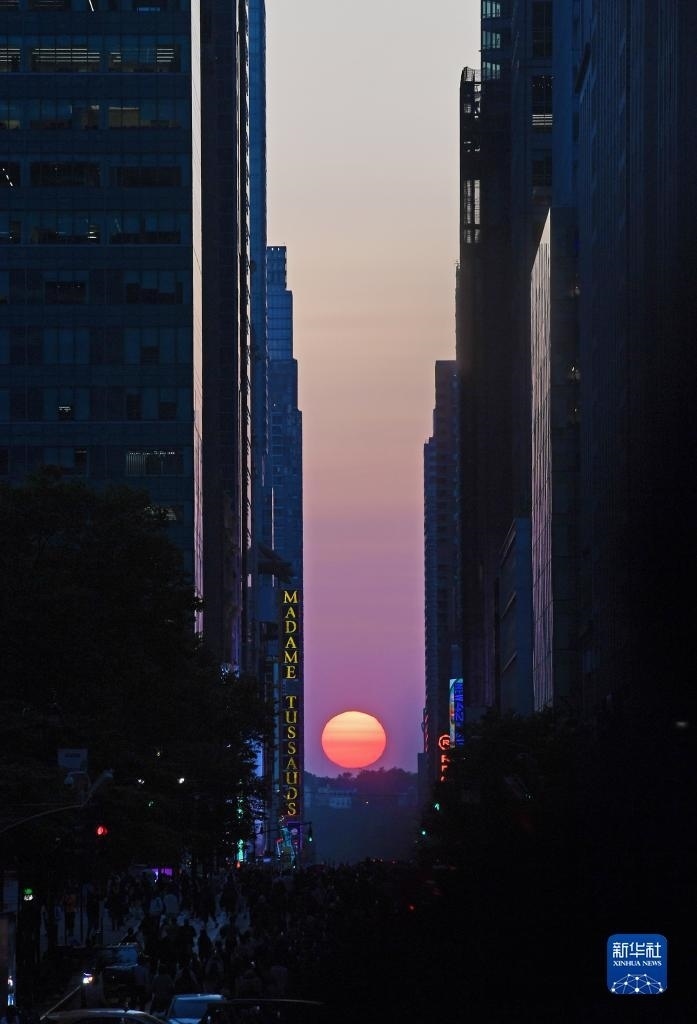 當(dāng)日,紐約出現(xiàn)“曼哈頓懸日”景觀?!奥D懸日”是紐約市標(biāo)志性景觀,每年5月和7月出現(xiàn)兩次,指日落時(shí)太陽(yáng)正好出現(xiàn)在曼哈頓東西向街道正上方、似乎懸在兩側(cè)高樓大廈之間的戲劇性畫(huà)面。新華社記者 李睿 攝