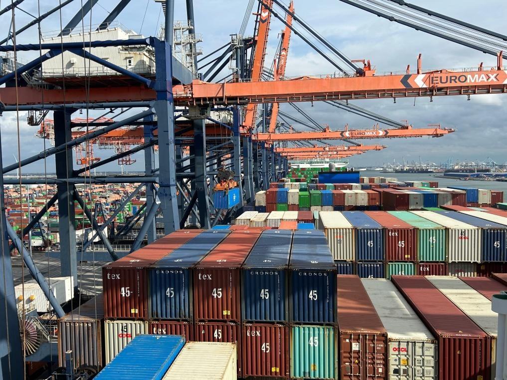 9月20日,“中遠(yuǎn)海運室女座”號集裝箱船??吭诤商m鹿特丹港作業(yè)。新華社發(fā)