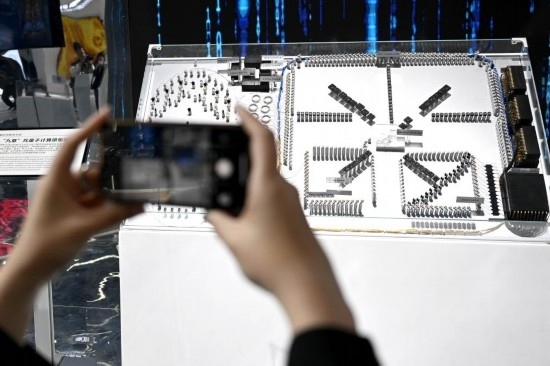 4月26日,觀眾在第二屆中國(安徽)科技創(chuàng)新成果轉(zhuǎn)化交易會上拍攝“九章”光量子計(jì)算原型機(jī)模型。新華社記者黃博涵 攝