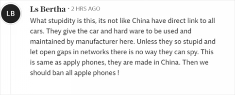 “這是多么愚蠢啊,中國又不是和所有汽車都有直接聯(lián)系。他們把汽車和硬件交給這里的制造商使用和維護(hù)。除非他們蠢到讓網(wǎng)絡(luò)出現(xiàn)漏洞,否則他們不可能進(jìn)行間諜活動。這和蘋果手機一樣,都是中國制造的。那么我們應(yīng)該禁止所有蘋果手機!”