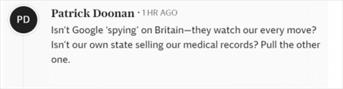 還有網(wǎng)友提到美國互聯(lián)網(wǎng)巨頭公司,“谷歌不是在‘監(jiān)視’英國嗎——他們監(jiān)視著我們的一舉一動?我們自己的地區(qū)不是在賣我們的醫(yī)療記錄嗎?”
