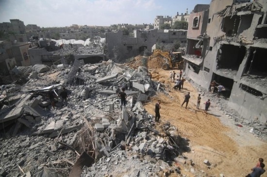 10月12日,在加沙地帶南部城市拉法,人們?cè)谠庖陨锌找u的受損建筑中救援傷者。新華社發(fā)(哈立德·奧馬爾攝)