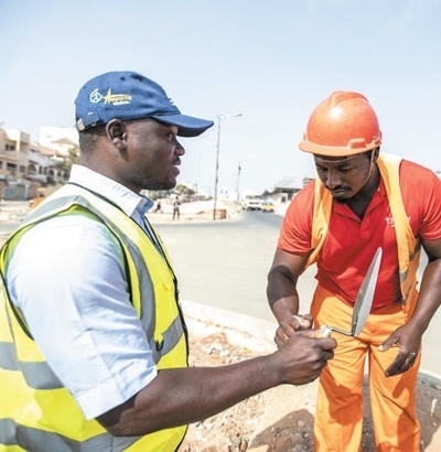 ?塞內(nèi)加爾達喀爾快速公交項目是塞內(nèi)加爾第一條城市快速公交線路。這條長約18公里的道路將穿過達喀爾人口密度最高的社區(qū)和核心商務(wù)區(qū),建成后有助于緩解首都交通壓力。圖為當?shù)貑T工在項目建設(shè)工地交流。新華社記者 李亞輝攝