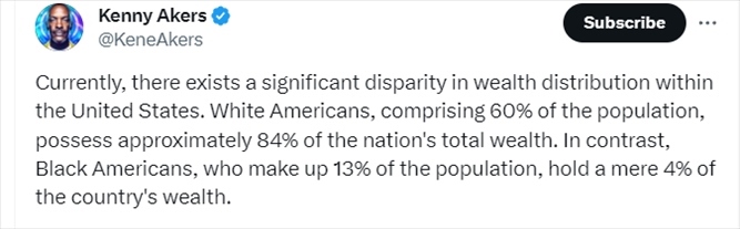 美國網(wǎng)友發(fā)文批評美國財富不平等現(xiàn)象表示,占據(jù)美國總?cè)丝?0%的白人擁有全美大約84%的財富,而占據(jù)人口13%的美國非裔卻只擁有4%。