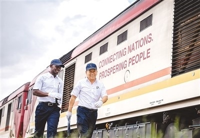 在肯尼亞內(nèi)羅畢,非洲之星鐵路運(yùn)營公司機(jī)輛部的火車駕駛員(右)與學(xué)員從蒙內(nèi)鐵路機(jī)車旁走過。新華社記者 王冠森攝