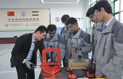 2022年,中亞地區(qū)首家魯班工坊在塔吉克斯坦啟動(dòng)運(yùn)營,為塔吉克斯坦開展職業(yè)培訓(xùn)作出了積極貢獻(xiàn)。圖為今年4月,在塔吉克斯坦魯班工坊,塔方教授向?qū)W生介紹中方捐贈(zèng)的設(shè)備。