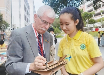 飛虎隊老兵后人蘭迪·斯科特為廣西柳州市壺西實驗中學學生留言。本報記者 祝佳祺攝