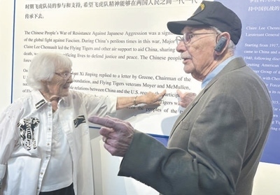 走進博物館,代表團成員在一張張老照片、一件件珍貴實物前流連,認真聆聽講解,還不時與身邊親友交談。麥克馬倫在展板上看到自己的名字后,興奮地向妻子珍妮弗指了指名字的位置。他曾擔任B—24轟炸機機頭炮手和助理飛行機械師,在昆明和成都參加對日作戰(zhàn)??粗AЧ窭锏恼蛊?,他感慨:“美中兩國人民的友誼將延綿不斷?!?/p>