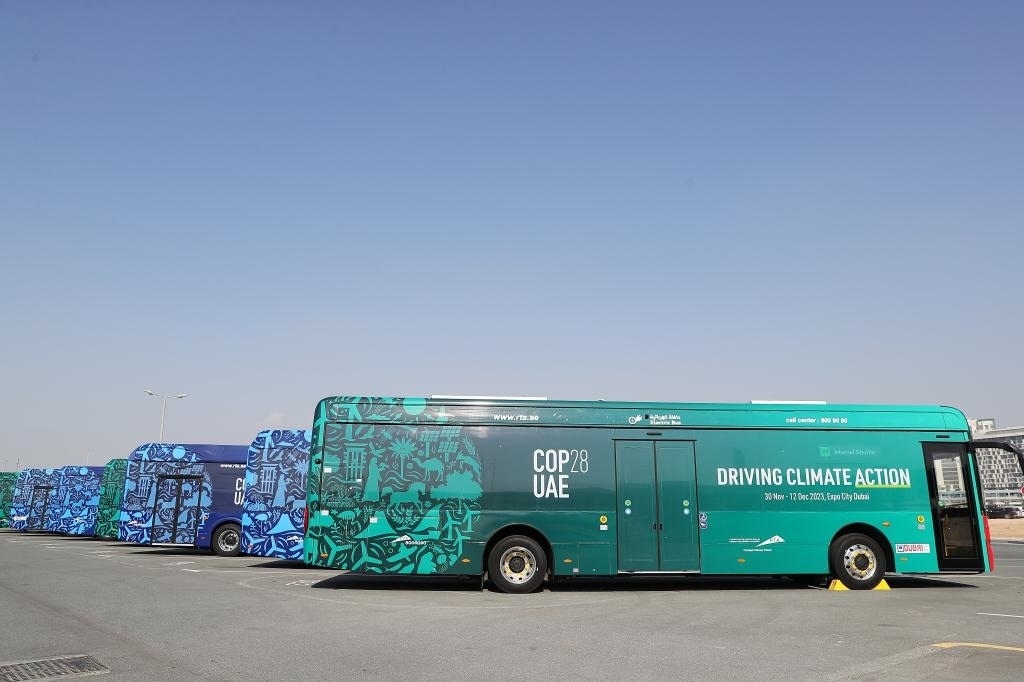 2023年12月3日,中國(guó)蘇州金龍公司的海格電動(dòng)巴士(前)停靠在聯(lián)合國(guó)氣候變化迪拜大會(huì)的擺渡車(chē)停車(chē)場(chǎng)。新華社記者 王東震 攝