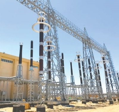 位于蘇伊士省的??怂_迪亞500千伏變電站項目現(xiàn)場,鐵塔高聳,一條條高壓輸電導(dǎo)線接入變電站設(shè)備,電流通過導(dǎo)線時發(fā)出嗡嗡聲。