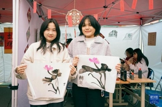 1月24日,“歡慶春節(jié)暨中越年俗文化交流體驗(yàn)”活動(dòng)在越南河內(nèi)的河內(nèi)大學(xué)舉辦,約500名學(xué)生及社會(huì)各界人士參加了書法、中國畫、剪紙、奧黛漢服秀和歌舞表演等體驗(yàn)活動(dòng),還品嘗了春卷、粽子、餃子、湯圓等傳統(tǒng)美食。這是兩名越南學(xué)生在活動(dòng)中展示自己繪制的中國畫作品。新華社記者 胡佳麗 攝