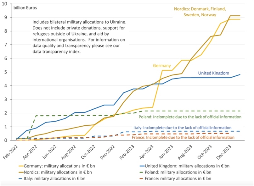 △歐洲國家對烏軍援圖表(圖片來源:基爾世界經(jīng)濟(jì)研究所)