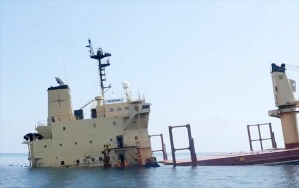 這張拍攝日期不明的照片顯示了英國(guó)貨輪“魯比馬爾”號(hào)沉沒(méi)前的景象。新華社發(fā)(也門(mén)政府供圖)