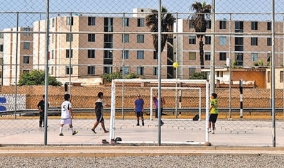 當?shù)厍嗌倌暝陧椖糠叫藿ǖ淖闱驁鰞?nèi)踢球。