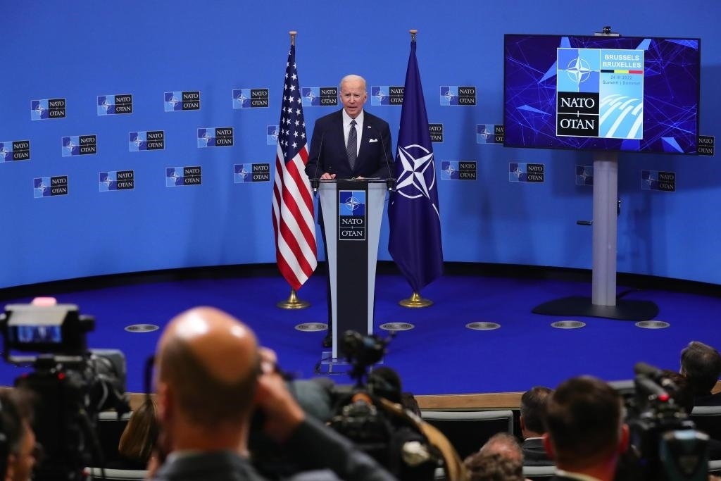 ?2022年3月24日,美國(guó)總統(tǒng)拜登在比利時(shí)布魯塞爾的北約總部出席北約特別峰會(huì)后的新聞發(fā)布會(huì)。新華社記者鄭煥松攝