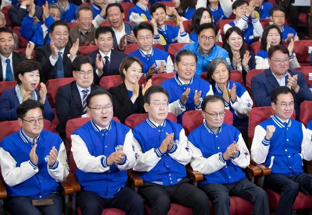 4月10日,在韓國(guó)首爾,韓國(guó)最大在野黨共同民主黨黨首李在明(前排中)與共同民主黨領(lǐng)導(dǎo)層共同慶祝出口民調(diào)結(jié)果大幅領(lǐng)先。新華社記者姚琪琳攝