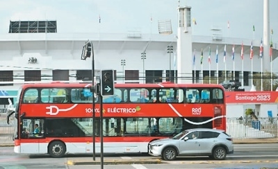 在智利首都圣地亞哥,一輛520路新能源公交車經(jīng)過2023泛美運(yùn)動會主場館。新華社記者 辛悅衛(wèi)攝