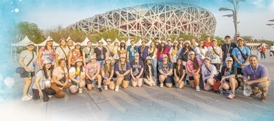 在北京國家體育場外,馬斯卡廷中學(xué)師生合影留念。