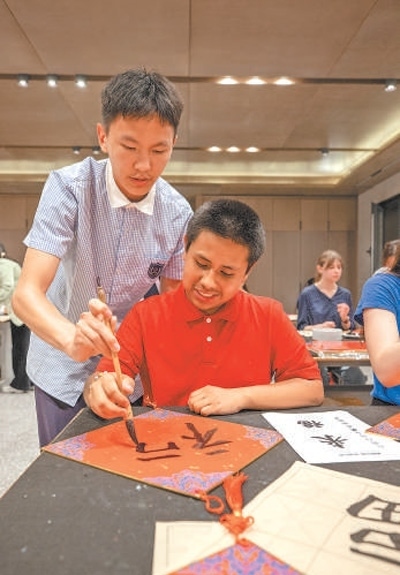 馬斯卡廷中學(xué)學(xué)生(前)在體驗漢字書法。